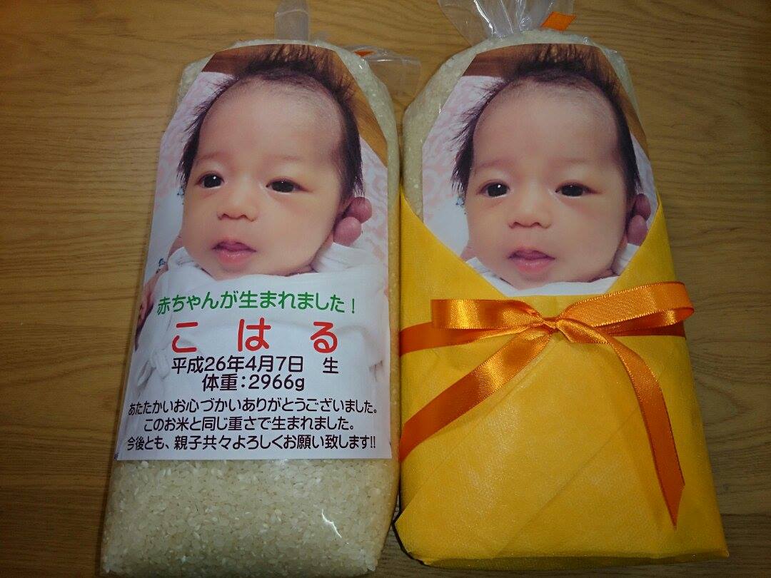 出産祝のお返しに、産まれたときの重さのお米とお顔の写真とメッセージを入れて『赤ちゃん米』